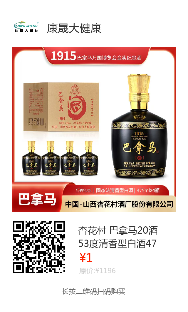 杏花村 巴拿马20酒53度清香型白酒475ml*4瓶